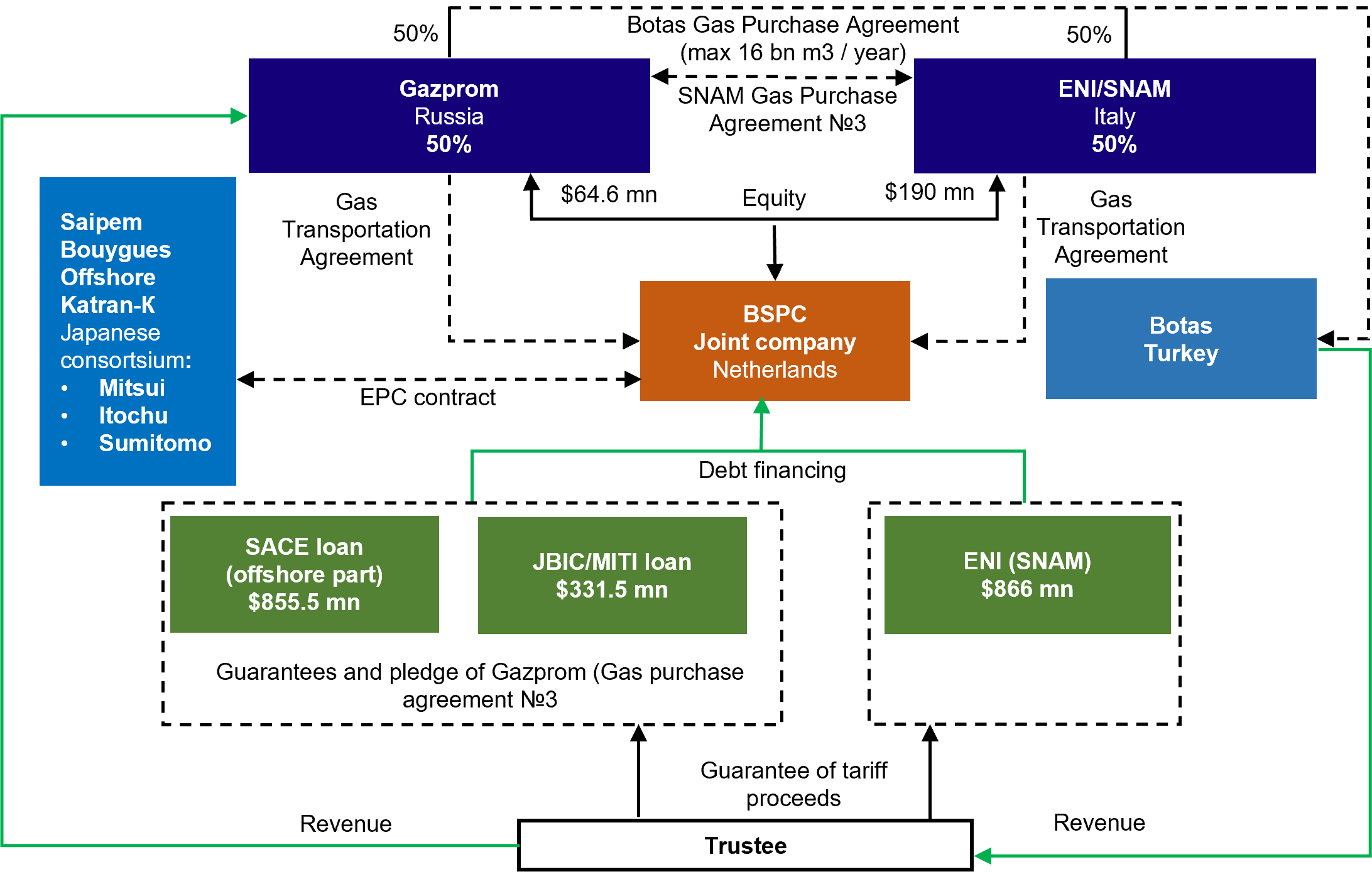 Offshore section is implemented as a joint project of Gazprom and Italian ENI/SNAM. Participation of the reputable foreign investor produces basis for the project financing structure and creates additional comfort for the lenders. We would like to highlight the following key /innovative features of the structure: